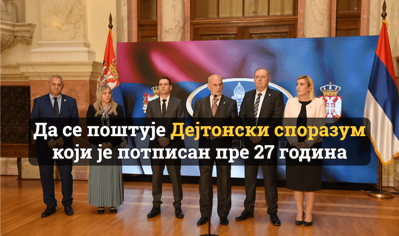 Српска коалиција НАДА коју чини Нови ДСС и ПОКС подсећа да је пре 27 година потписан Дејтонски споразум у Паризу и тражи враћање његове примене у изворном облику.