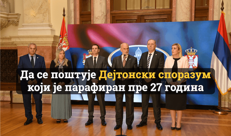 Српска коалиција НАДА коју чини Нови ДСС и ПОКС подсећа да је пре 27 година парафиран Дејтонски споразум и тражи враћање његове примене у изворном облику.