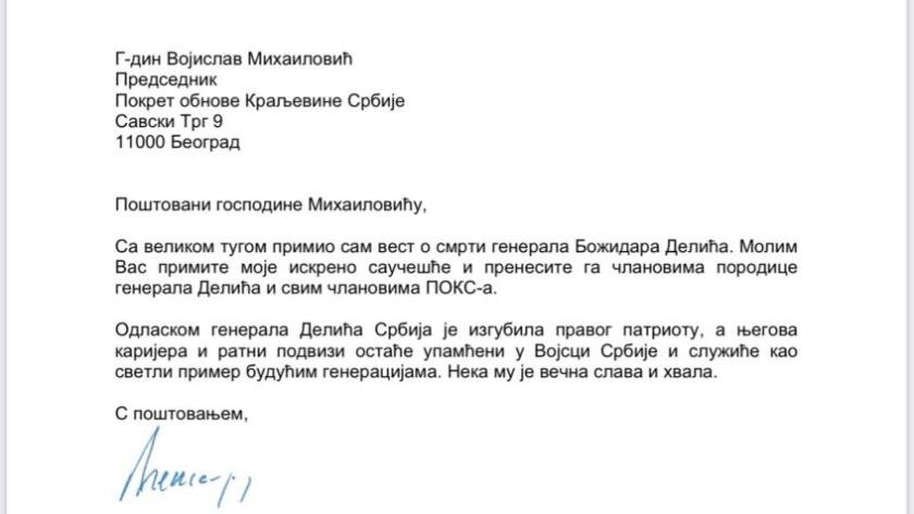Њ.К.В. Престолонаследник Александар Карађорђевић упутио је саучешће председнику Војиславу Михаиловићу и свим чалновима ПОКС поводом смрти генерала Божидара Делића.