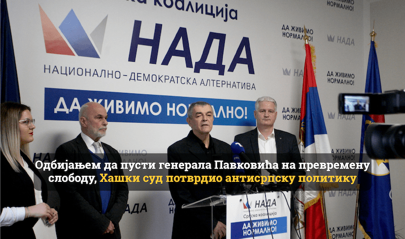 Српска коалиција НАДА коју чине ДСС, ПОКС Војислава Михаиловића и покрет ”Нема назад иза је Србија” чији је председник генерал Божидар Делић, најоштрије осуђује одлуку Хашког суда да одбије захтев…
