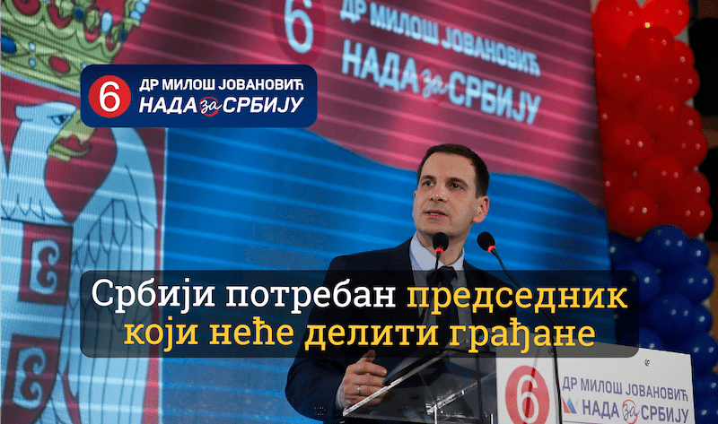 Кандидат за председника Србије испред Српске коалиције НАДА коју чини ПОКС и ДСС, др Милош Јовановић, поручио је да је Србији потребан председник који неће делити грађане и свађати политичке…