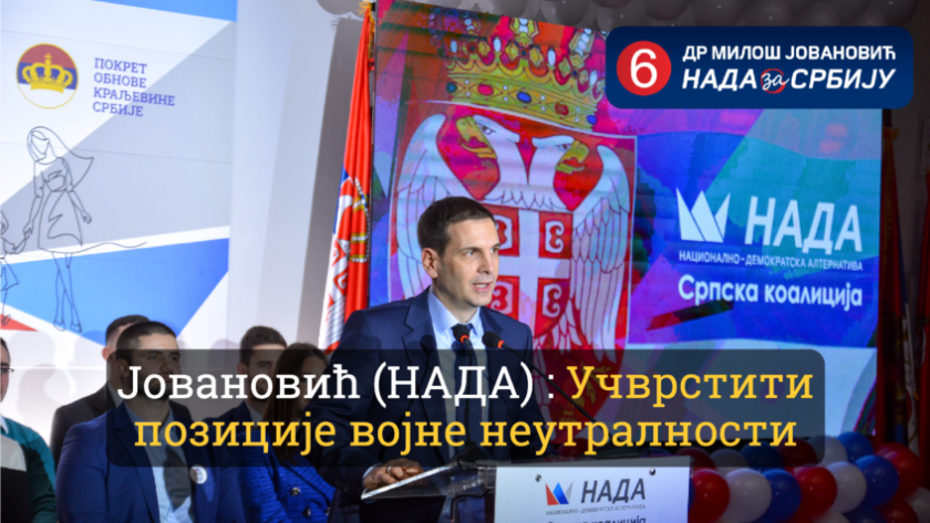 Кандидат за председника Србије испред Српске коалиције НАДА, др Милош Јовановић залагаће се да се нормативно учврсти позиција војне неутралности Србије.